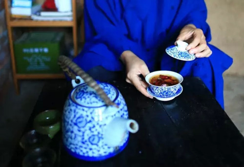 闲时,道长会沏茶读书。她给自己的花茶起名“九花三宝茶“,味甜,回甘悠长。所谓九花,大概有桂花、玫瑰、茉莉、红巧梅、勿忘我、百合、桃花等,不一而足。